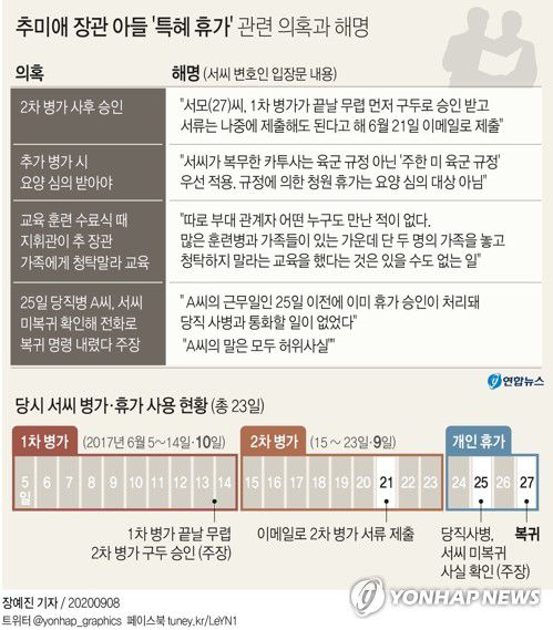 (서울=연합뉴스) 임성호 최평천 기자 = 추미애 법무부 장관 아들 서모(27)씨 측이 카투사(KATUSA·미군에 배속된 한국군) 휴가는 한국 육군이 아닌 주한미군 규정에 따른다며 서씨에게 제기된 '특혜 휴가' 의혹을 부인했다.