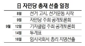 자민당은 이날 아베 신조 총리의 사의 표명에 따른 총재선거(14일)를 고시하고 후보 등록을 받았다. 당선자는 다수당인 자민당의 새 총재로 취임해 오는 16일 소집되는 임시국회에서 차기 총리로 지명 선출된다. 스가 관방장관을 비롯해 이미 입후보 의사를 밝혔던 기시다 후미오(63) 자민당 정무조사회장, 이시바 시게루(63) 전 자민당 간사장 등 3명이 각각 지지 의원 20명 이상의 추천을 받아 후보 등록을 마쳤다.