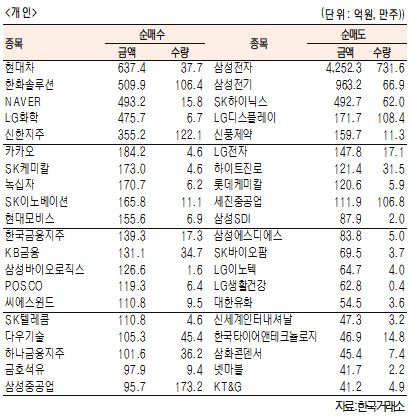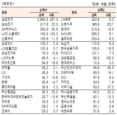 [표]유가증권 기관·외국인·개인 순매수·도 상위종목(9월 8일-최종치)
