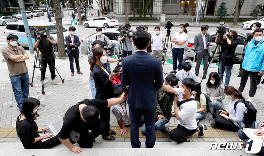 (서울=뉴스1) 허경 기자 = 추미애 법무부 장관의 아들 서모 씨의 법률 대리인인 현근택 변호사가 9일 오후 서울 종로구 서울지방경찰청에서 서 씨의 부대 배치 관련 청탁이 있었다고 언급한 당시 주한미군 한국군지원단장과 해당 발언의 녹취 내용을 보도한 방송사 SBS에 대한 고발장을 제출한 뒤 기자회견을 하고 있다. 2020.9.9/뉴스1