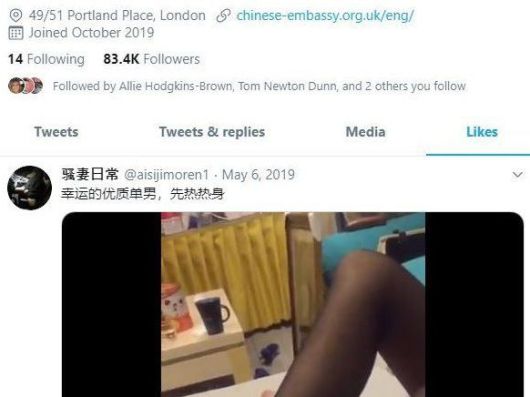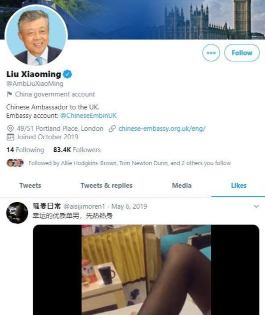 류샤오밍 주영 중국대사 트위터 계정, 음란영상·반중트윗 등에 ‘좋아요’ 눌러