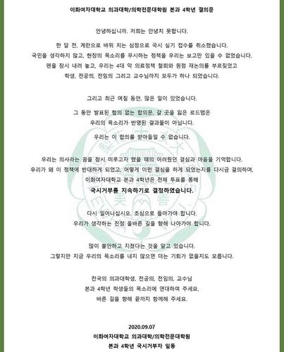 이화여대 의대 본과 4학년들은 "그동안 발표된 협의 없는 합의문, 갈 곳을 잃은 로드맵은 우리의 목소리가 반영된 결과물이 아니기 때문에 받아들일 수 없다"며 "이화여자대학교 본과 4학년은 전체 투표를 통해 국시 거부를 지속하기로 결정했다"는 내용의 결의문을 냈다.