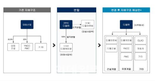인적분할과 물적분할을 동시에 추진해 대림산업을 존속법인인 지주회사 ‘디엘 주식회사’(가칭)와 건설사업을 담당하는 ‘디엘이앤씨’(가칭), 석유화학회사인 ‘디엘케미칼’(가칭)로 분할하게 된다. 대림은 오는 12월 4일 임시주주총회를 거쳐 내년 1월 1일 지주회사를 출범할 계획이다.