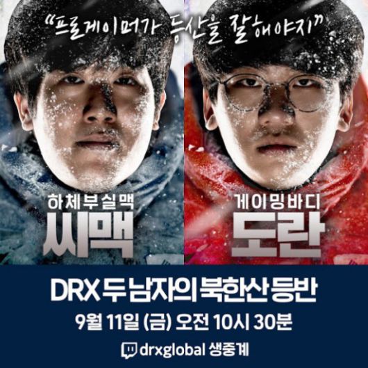 10일 DRX는 공식 SNS에 씨맥 김대호 감독과 도란 최현준 선수의 등산을 중계한다는 공지를 게재했다.