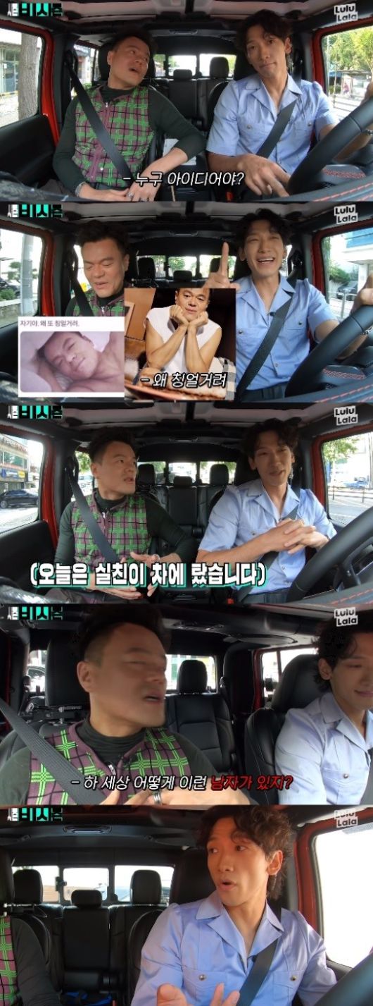 이날 비는 JYP로 박진영을 직접 태우러 갔다. 비는 "이 분은 나의 정신적인 지주이자 두번째 아버지"라며 "제작진 분들이 저에게 떨려보인다고 하는데 사실 좀 떨리다"고 말했다. 박진영은 "'차에 타봐'는 누구 아이디어냐"고 물었고, 비가 자신의 아이디어라고 하자 "지훈이 아이디어 많이 좋아졌다. 예능 완전 포기였는데"라고 감탄했다.