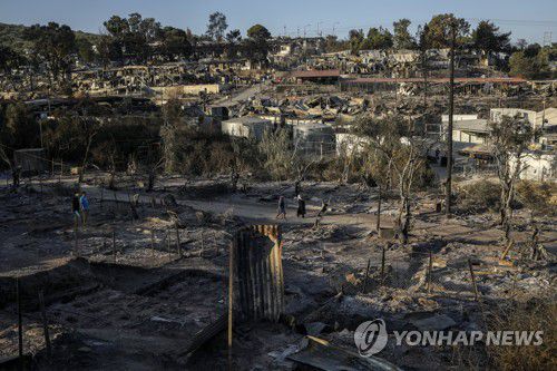 화마가 휩쓸고 간 그리스 레스보스섬 난민촌 [AP=연합뉴스] |
