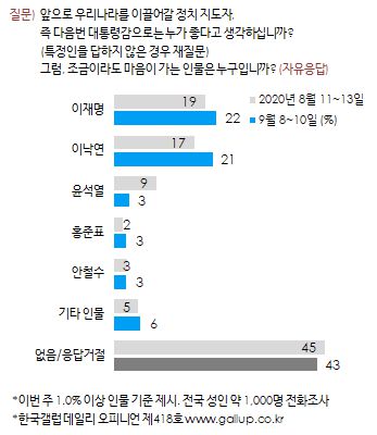 반면 지난 주 9%였던 윤석열 총장에 대한 선호도는 3%로, 한 주 새 3분의 1로 낮아졌다. 홍준표 전 자유한국당 대표, 안철수 국민의당 대표도 각각 3%를 기록했다. 기타 인물들에 대한 선호도는 모두 합쳐 6%에 그쳤다.