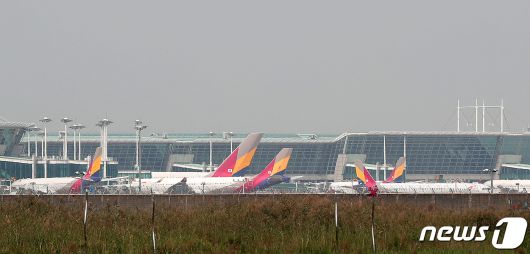 (인천=뉴스1) 구윤성 기자 = 아시아나항공 매각 무산(노딜)이 공식화될 것으로 알려진 11일 인천국제공항 주기장에 아시아나항공 여객기들이 세워져 있다. 금융권에 따르면 이날 기간산업안정기금 운용심의회는 아시아나에 2조원 투입 등 아시아나항공 정상화를 위한 '플랜B'도 논의할 예정이다. 노딜이 확정되면 아시아나항공은 산은 등 채권단 관리 체제로 전환한다. 채권단은 영구채를 주식으로 전환해 아시아나항공 지분 37%를 보유한 최대주주가 된다. 2020.9.11/뉴스1