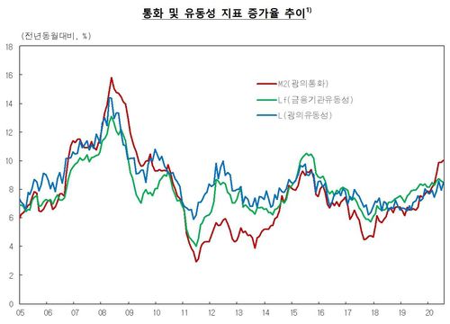 (서울=연합뉴스) 신호경 기자 = 신종 코로나바이러스 감염증(코로나19) 사태와 저금리 환경 속에서 기업과 가계가 대출을 통해 자금을 대거 끌어 쓰자 시중 통화량도 계속 빠르게 불어나고 있다.