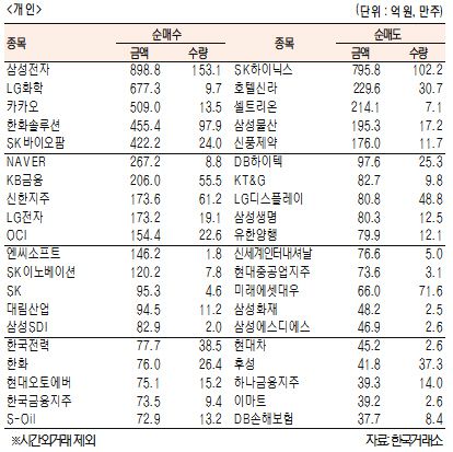 [표]유가증권 기관·외국인·개인 순매수·도 상위종목(9월 11일)