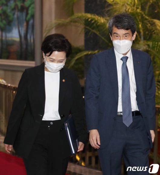 (서울=뉴스1) 송원영 기자 = 김현미 국토교통부 장관과 이동걸 KDB산업은행 회장이 11일 서울 세종로 정부서울청사에서 비공개로 열린 회의를 마치고 청사를 나오고 있다. 이날 정부는 정부서울청사에서 산업경쟁력 강화 장관 회의를 열고 아시아나항공 인수 무산 후 경영 정상화 방안을 논의할 것으로 전해졌다. 2020.9.11/뉴스1