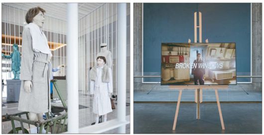 부조리한 세상을 풍자한 요스 드 그뤼터&해럴드 타이스의 부산비엔날레 출품작 `몬도 카네` (왼쪽)와 인공지능(AI)을 활용한 히토 슈타이얼의 대전비엔날레 출품작 `깨진 창문들의 도시`. [사진 제공 = 부산비엔날레·대전비엔날레] |