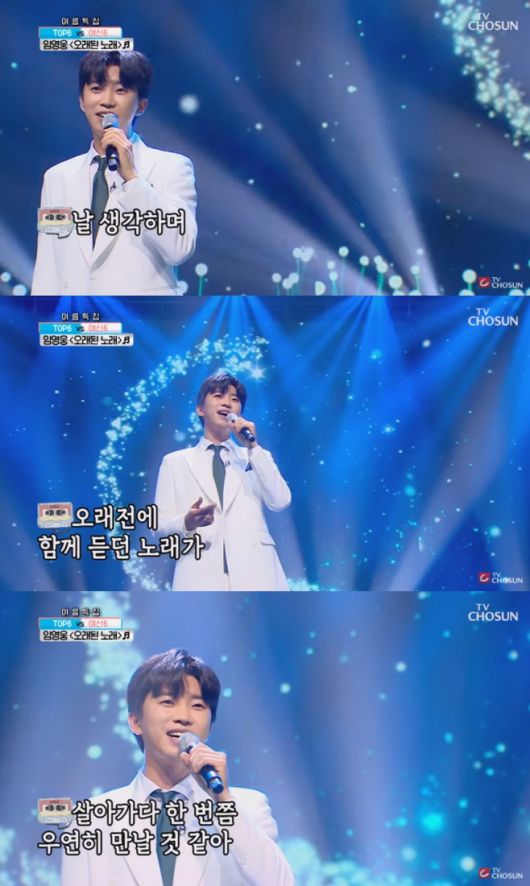 이날 방송에서는 임영웅이 스탠딩 에그의 ‘오래된 노래’를 열창했다. 잔잔한 감성이 임영웅의 감미로운 목소리와 만나며 시너지를 불러일으켰다.