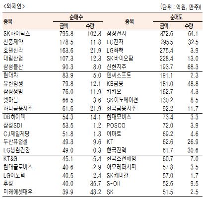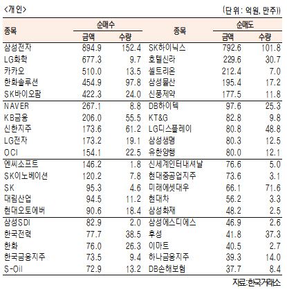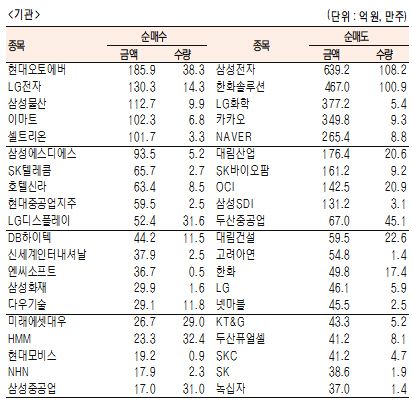 [표]유가증권 기관·외국인·개인 순매수·도 상위종목(9월 11일-최종치)
