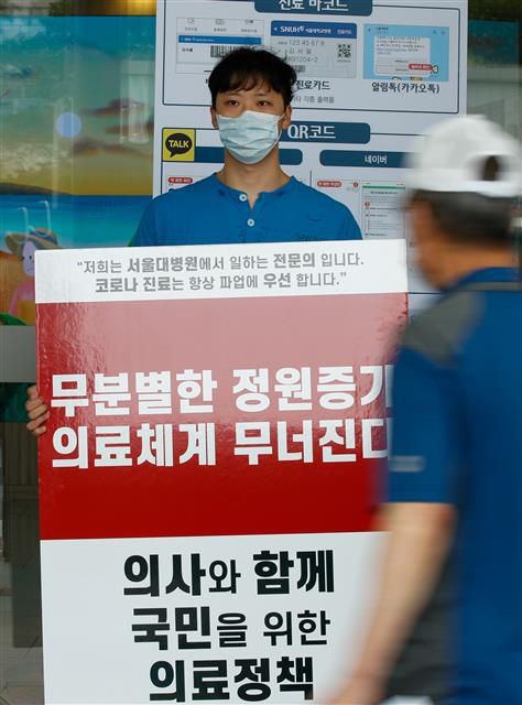 서울대병원에서 피켓 든 의료진 - 전공의들이 무기한 파업을 지속하기로 한 31일 서울 종로구 서울대병원 본관 앞에서 한 전문의가 정부가 추진하고 있는 의대 정원 확대, 공공의대 설립 등을 반대하며 1인 피켓 시위를 하고 있다. 서울대병원은 전공의?전임의 파업으로 교수들의 진료부담이 과중해지자 이날부터 일주일간 내과 외래진료를 축소하기로 했다. 2020.8.31/뉴스1 |