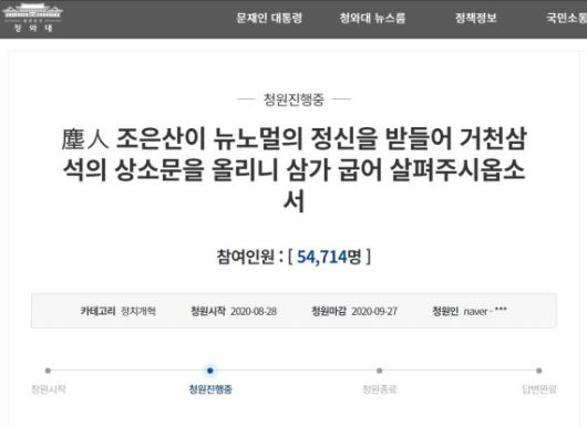 12일 청와대 국민청원 게시판의 조은산 씨의 네 번째 청원은 이날 오후 3시 30분 기준 5만4714명의 동의를 모았다. 이 청원 역시 문재인 대통령을 '폐하'로 지목하며 올리는 상소문 형식으로 게재됐다.