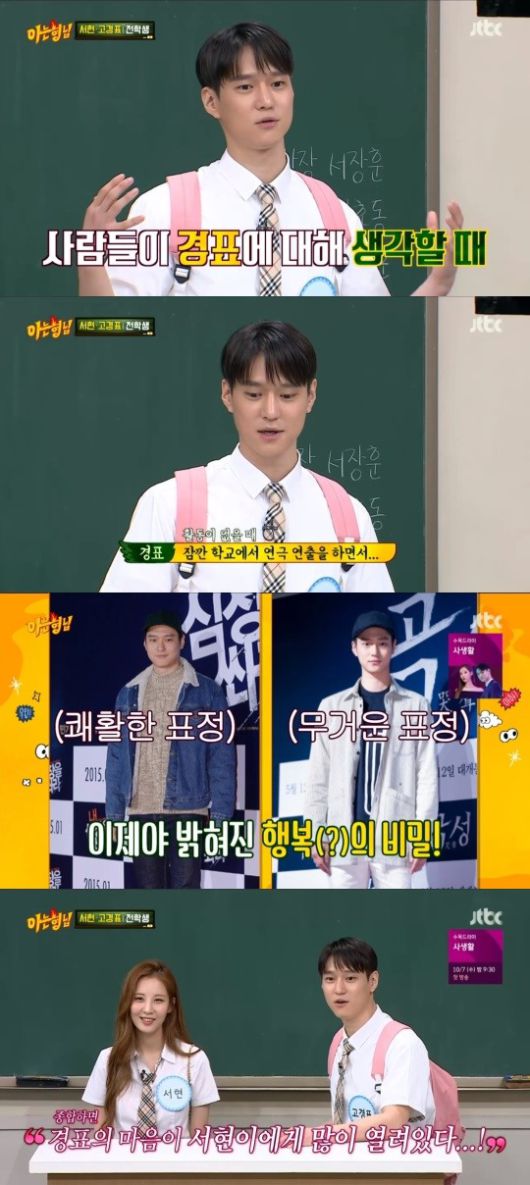 이때 이수근은 서현에게 소녀시대 멤버들과 아직 친하냐 물었다. 그러자 강호동은 "고경표 앞에서 소녀시대 얘기하면 안 된다"며 "기사 봤는데 고경표가 실물이 가장 예쁜 연예인 1위로 윤아를 꼽았더라"고 말했다.