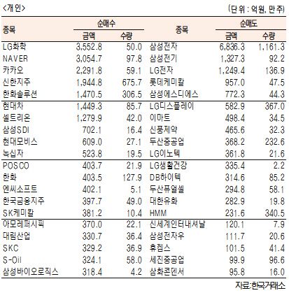 [표]주간 유가증권 기관·외국인·개인 순매수·도 상위종목(9월 7일~11일)
