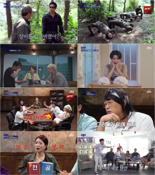 [이데일리 스타in 김은구 기자] JTBC ‘장르만 코미디’의 코너 ‘장르만 연예인’에서 ‘가짜사나이’ 이근 대위가 칼 분실부터 답답한 속도, 빈약한 결과물까지 이어지는 멤버들의 총체적 난국에 분노를 폭발시켰다. 결국 단체로 배 튀기기 기합을 받게 된 멤버들의 모습이 안습을 유발했다.