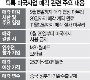한편 현재 틱톡 미국사업 인수전은 마이크로소프트(MS)와 월마트 연합 대 오라클의 2파전으로 전개되고 있다. 매각예상 가격은 최대 500억달러에 달한다.