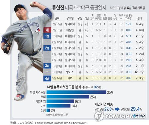 (서울=연합뉴스) 하남직 기자 = 류현진(33·토론토 블루제이스)이 송곳 제구와 다양한 변화구로 고비를 넘기며 시즌 4승(1패)째이자, 홈경기 첫 승리를 거뒀다.
