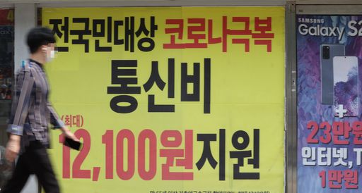 문재인 대통령이 제8차 비상경제회의에서 만 13세 이상 전 국민에게 2만원씩 통신비 지원을 언급한 지난 10일 서울시내 한 통신사 매장에 관련 광고문이 붙어 있다. 연합뉴스 |