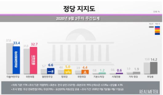 14일 여론조사기관 리얼미터가 YTN 의뢰로 실시한 조사에서 민주당 지지율은 전주 대비 4.4%포인트 떨어진 33.4%, 국민의힘 지지율은 1.7%포인트 오른 32.7%로 조사됐다.