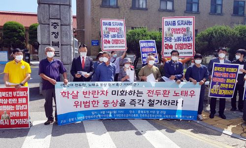 충북 5·18민중항쟁 40주년 행사위원회 등 5개 단체는 14일 충북도청 앞에서 기자회견을 열어 "오늘부터 전국적으로 '청남대 전두환·노태우 동상 철폐 국민행동 대책위원회'를 조직해 반민족 독재 역사 청산 운동에 나설 것"이라고 밝혔다.