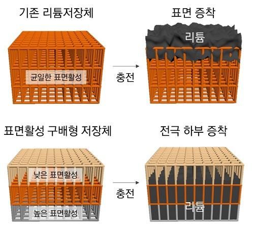 하지만 배터리 작동 시 전극 주변에 나뭇가지 모양의 리튬 결정(리튬 수지상)이 부산물로 발생해 성능을 떨어뜨리는 문제가 있다. 연구팀은 3차원 구조체를 만들어 내부에 부산물을 저장할 수 있는 기술을 개발했다. 특수한 설계를 통해 부산물이 전극 아래쪽부터 차곡차곡 쌓이게 함으로써 배터리의 성능을 유지할 수 있게 됐다.
