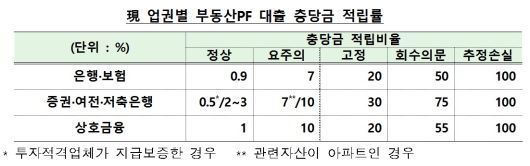 금융당국은 감독규정 개정의 일환으로 부동산 PF 관련 대손충당금 적립기준을 강화한다. 현재 저축은행 업권은 은행과 보험, 상호금융권과 달리 부동산 PF 대출과 관련해 적립률 하향조정 기준이 적용된다. 우량 시공사 등 투자적격업체가 지급보증하거나 PF 대출 관련자산이 아파트인 경우 적립률이 하향조정된다. 금융당국은 지급보증의 경우 리스크 관리 없이 자산확대에 치중하게 할 소지가 있으며 PF 대출 자산이 아파트라고 해서 부실가능성이 더 낮다는 일률적 판단이 어렵다고 봤다.