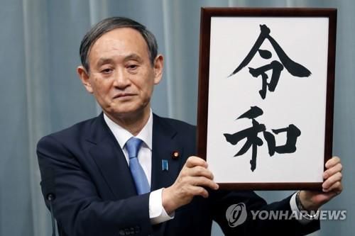 2019년 4월 1일 스가 요시히데 일본 관방장관이 일본의 새 연호 레이와(令和)가 적힌 액자를 들어 보이고 있다. 스가는 이 장면으로 인해 '레이와 아저씨'라는 별명을 얻었다. 레이와 연호 발표는 정치인 스가의 인지도를 높인 사건이었다. [AP=연합뉴스 자료사진] |
