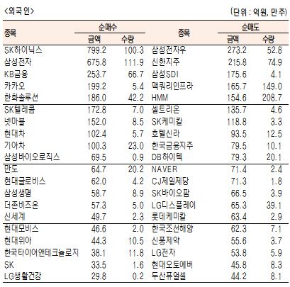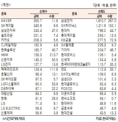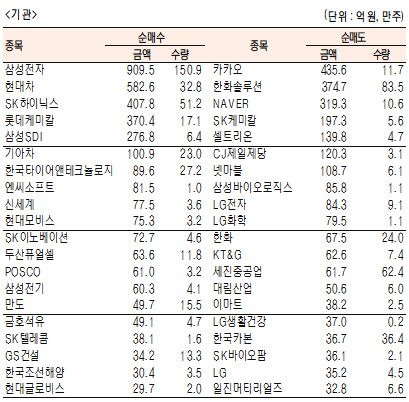 [표]유가증권 기관·외국인·개인 순매수·도 상위종목(9월 14일)