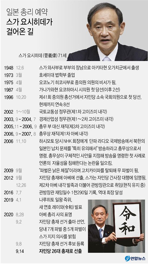 하지만 보름 새 분위기가 조금 달라졌다. 30년 만에 ‘무파벌, 비세습’ 자민당 총재가 탄생했다고 강조한 보도들이 눈에 띈다. 게다가 스가 총재는 일본 정치권에서 배제돼온 도호쿠 지방 출신이다. 당초 그는 아베 총리의 남은 임기 1년을 이어받아 차기 총선 때까지 자민당의 관리자 역할을 하는 데 그칠 것이라는 시각이 많았다. 그런데 총재 선거를 준비하면서 당내 주요 파벌들을 아우르며 압승을 거뒀다.
