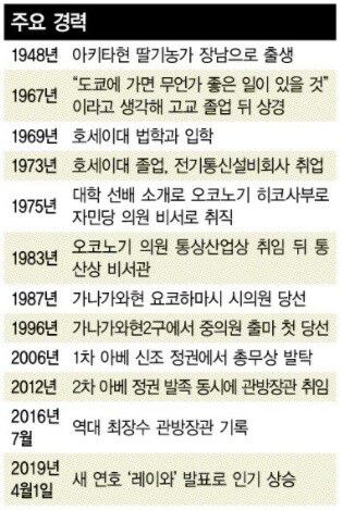 스가 총재는 혼슈 아키타현에서 딸기농사를 짓던 부농의 아들이었으나, 정계에서는 자수성가했다. 비서관에서 시작해 연고도 없는 요코하마 시의원, 중의원(가나가와현 제2구)을 거쳤고, 관방장관에 이어 총리까지 오르게 된 비세습 정치인의 상징이다.