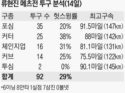 류현진은 1회 2사 뒤 적시타를 허용하면서 실점했지만 2회부터는 특유의 위기 관리 능력이 빛났다. 2회 무사 1루에서 지난해 신인왕 피트 알론소를 병살타로 이끌었고 4회에 안타 2개를 맞았지만 삼진 3개를 잡아내 실점하지 않았다.
