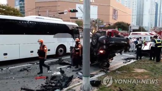 부산경찰청에 따르면 지난 14일 오후 5시 43분경 해운대구 중동 이마트 앞 교차로에서 고속으로 달리던 포르쉐 SUV가 앞서가던 오토바이와 승용차를 잇따라 들이 받은 사고가 발생했다.