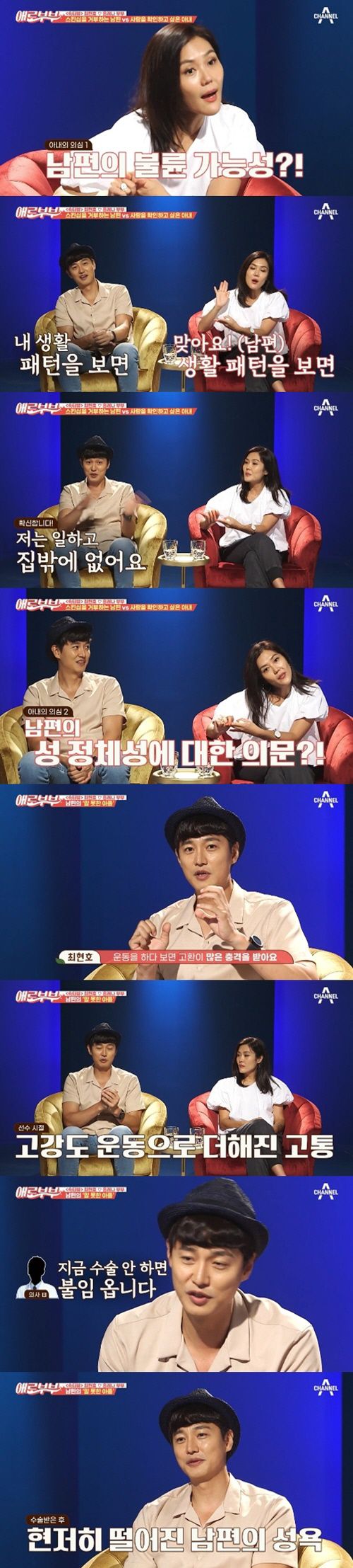 두 사람의 부부관계는 10개월 전이 마지막이었다. 최현호는 잠자리에 관심이 없다고 했고 홍레나는 “애인이 있나 생각을 없지 않아 했다. 생활 패턴을 볼 때 있을 순 없다. 그러면 남자를 좋아하나”라며 의심했다.
