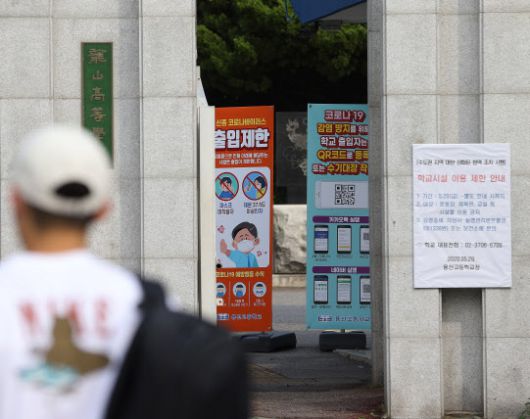 교육부는 15일 수도권 전면 원격 수업을 예정대로 20일 종료하고 21일 등교를 재개한다고 밝혔다. 이날 오후 서울 용산고등학교 교문에 코로나19 확산 방지 안내 수칙 관련 안내문이 세워져 있다.(사진=연합뉴스) |