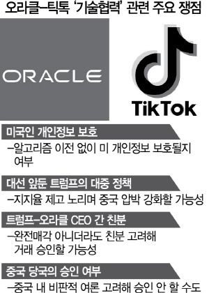 미국 행정부가 소프트웨어 업체 오라클과 중국의 짧은 동영상 공유 앱 틱톡 간 거래가 적절한지 검토하겠다고 밝혔다. 틱톡 모회사 바이트댄스가 오라클에 ‘완전매각’이 아닌 ‘기술협력’을 제안한 것으로 알려진 가운데 완전매각하지 않아도 틱톡이 정보유출 의혹을 불식시킬 수 있는지가 이번 거래의 성사 여부를 가를 것으로 보인다. 승인의 최종 결정권자는 도널드 트럼프 미 대통령이어서 결국 대통령의 대중(對中) 행보를 끝까지 주목해야 한다는 분석이 나온다.