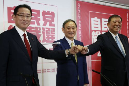 (왼쪽부터) 기시다 후미오 자민당 정조회장과 스가 요시히데 관방장관, 이시바 시게루 전 자민당 간사장이 8일(현지시간) 일본 도쿄 자민당 본부에서 공동 기자회견을 앞두고 포즈를 취하고 있다. 도쿄/AP연합뉴스 |
