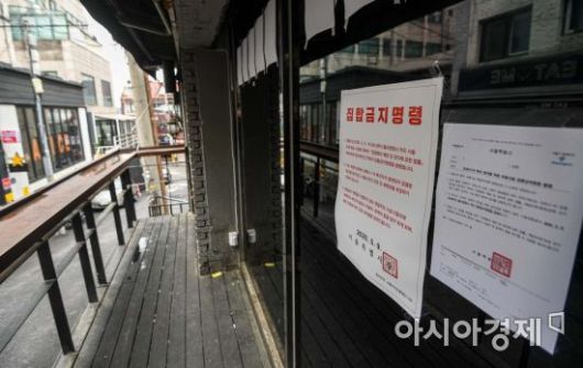 '집합금지 명령'으로 문을 닫은 업소 출입문에 행정명령서가 게시돼 있다. 사진은 기사와 무관함 /강진형 기자aymsdream@ |