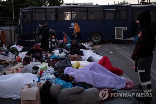 캠프 주변 길에서 잠을 청하는 그리스 레스보스섬 모리아 난민캠프 체류자들. 2020.9.11. [로이터=연합뉴스] |