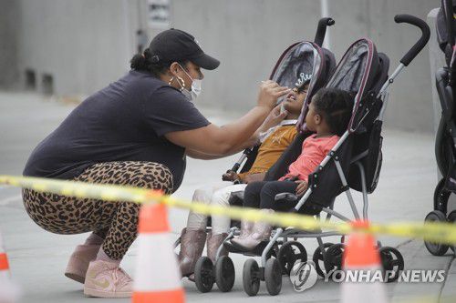 미국 LA 코로나19 이동검사소의 어린이 검체 채취 모습 |