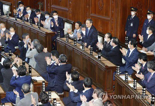 '스가 총리 탄생'…일본 중의원 본회의에서 손뼉 치는 자민당 의원들 |