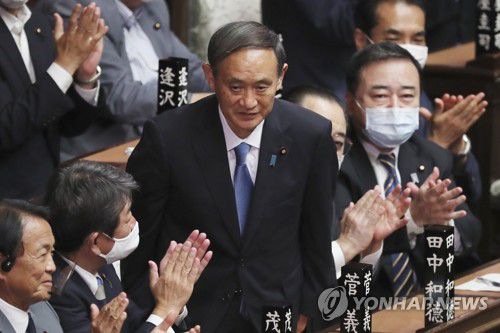 의원들 박수에 고개 숙이는 스가 일본 신임총리 |