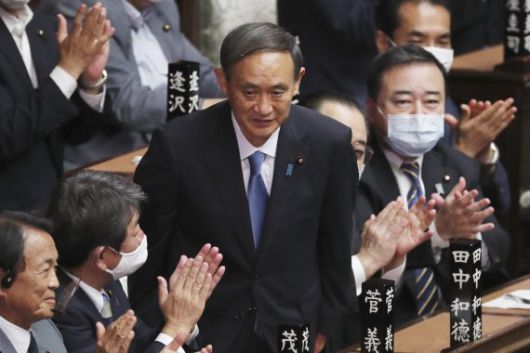 스가 요시히데 일본 신임 총리가 16일 도쿄에서 실시된 중의원 총리 지명선거에서 당선된 후 박수를 받고 있다. 스가는 중의원에서 총투표수 462표 가운데 314표를 얻어 99대 일본 총리로 뽑혔다. AP뉴시스 |