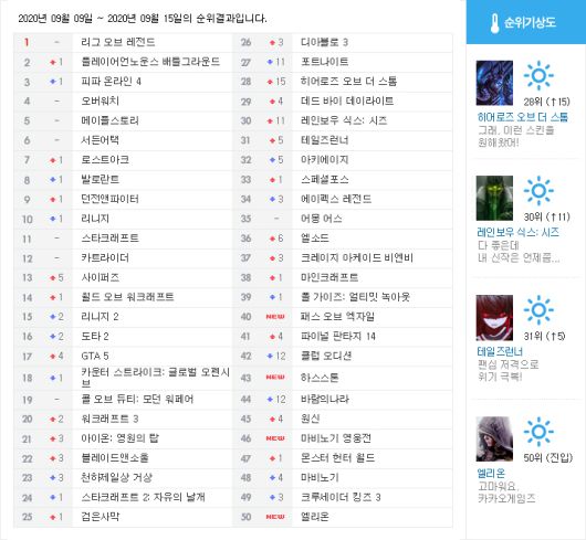 이번 주 상위권에서는 사이퍼즈가 지난주보다 5계단 상승한 13위에 자리했다. 주 상승 요인은 지난 10일에 시작된 공식전 새 시즌이다. 공식전이 새로 문을 연만큼 지난 시즌 말에 쉬던 유저도 다시 돌아와서 랭크 경쟁에 열을 올려야 할 때다. 사이퍼즈는 이번 주에 PC방 이용량이 늘었는데 신규 시즌 시작에 맞춰 유저 유입이 늘어난 것으로 분석된다.