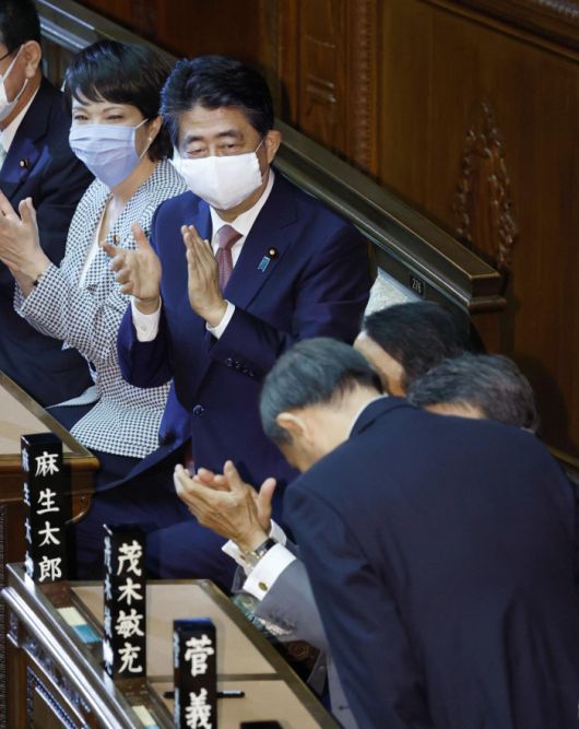 90도 인사 스가 요시히데 일본 자민당 총재가 16일 중·참의원 본회의에서 제99대 총리로 지명된 후 고개 숙여 인사하자 아베 신조 전 총리(위에서 두번째)가 축하하고 있다. 도쿄 | 연합뉴스 |