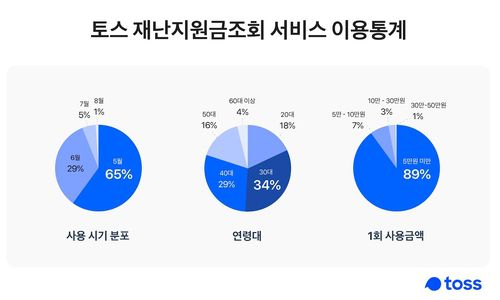 모바일 금융 서비스 '토스'를 운영하는 비바리퍼블리카는 토스의 '재난지원금조회' 서비스 이용자 77만8천명을 분석한 결과 재난지원금 지급 첫 달인 5월에 사용된 금액이 2천555억원으로 전체 사용 금액의 65%에 달했다고 17일 밝혔다.