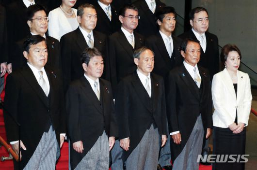 [도쿄=AP/뉴시스]지난 16일 스가 요시히데 일본 총리(앞줄 가운데)가 내각을 출범했다. 도쿄 소재 총리 관저에서 첫 각의(국무회의)를 마친 후 내각 각료들과 기념촬영을 하고 있다. 그의 바로 뒤에는 고노 다로 행정개혁·규제개혁상(뒷줄 가운데)이 서있다. 2020.09.17. |